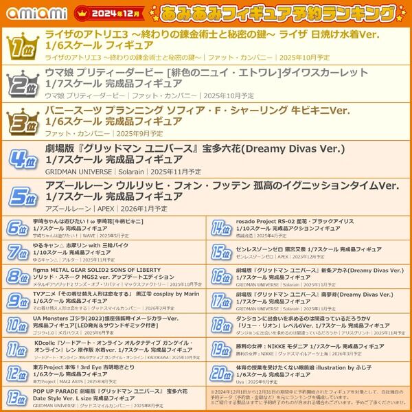 @hobbywatch_jp1位は日焼け水着の「ライザ」がラインクイン! 「2024年12月あみあみフィギュア月間ランキング」が公開 アズレン、ウマ娘、グリッドマンからも上位にランクイン hobby.watch.impress.co.jp/docs/news/1654… #あみあみ #フィギュア pic.x.com/IYPkfTEQau